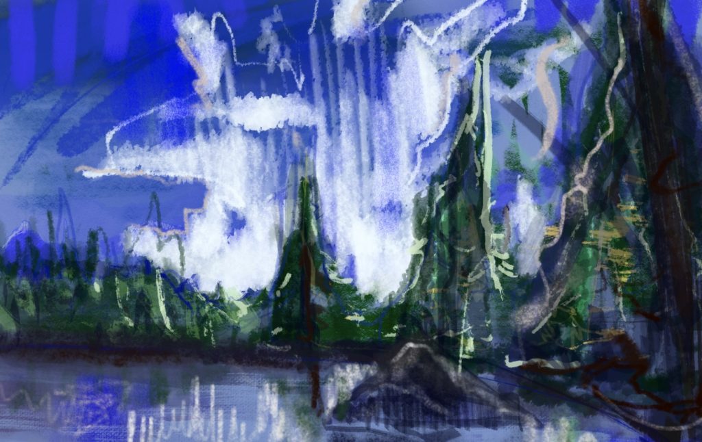 This is a composition of some trees in a line in a reasonably generic alpine type setting. Basically my sort of warmup to loosen my hand and get colors moving when drawing. There is an exceptional futility to producing digital art in 2026. It’s tragic but I also think the ease of producing a perfect image exactly how you imagine it with gemini adds a thrill where you as an artist are forced to confront the basic facts of your work. Like why are you doing it and what is your true aesthetic position…